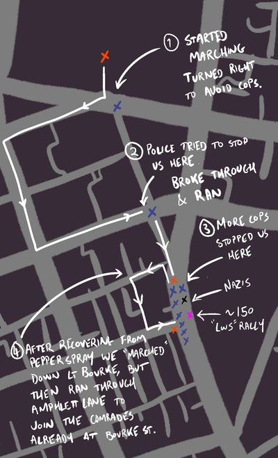That was when organizers decided to use my shortcut. We pretended to march down Little Bourke Street, but then sprinted through Amphlett Lane and joined the other counter-protesters on Bourke Street.